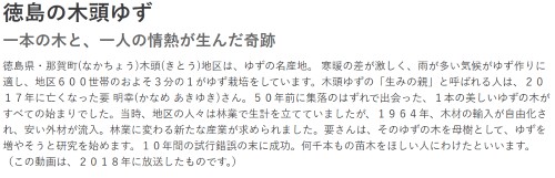 すっかり木頭柚子の虜になったウオッチドッグ記者は、後日、名産品の成り立ちを調べたら、NHKアーカイブスの動画を見つけた。木頭柚子を今のような名産品に育てた人物の軌跡が取り上げられていた。