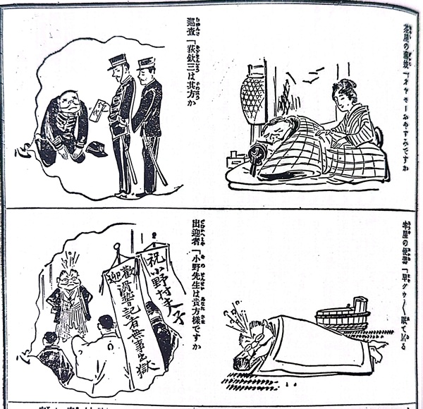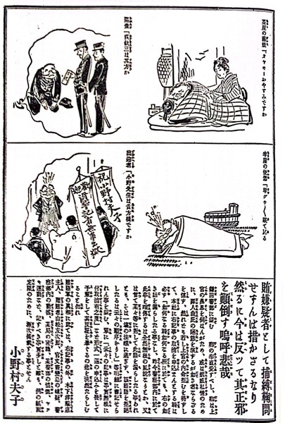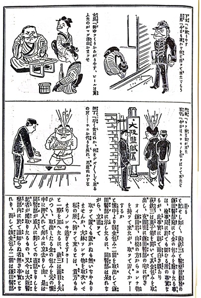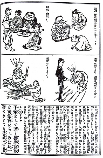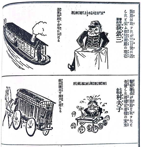賄賂を受け取った萩欽三署長を上段、滑稽記者の小野村夫子(※宮武外骨のペンネーム)を下段に主人公として登場させ、2つのストーリーを比較させながら、栄華と没落のストーリーを滑稽に表現し、収賄署長を一刀両断している。