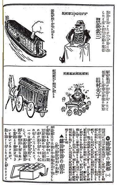 大阪府水上警察署の署長の収賄を報道したことがきっかけで、明治のジャーナリスト、宮武外骨は大阪地方裁判所から「官吏侮辱罪」の罪状を言い渡された。禁錮刑が確定したら、刑務所に収監させられる。この判決を「蛮的判決」と呼び、控訴院に控訴した一方、明治37年(1904年)3月23日発行の滑稽新聞第69号でも、「賄賂軍の真相」と題してますます収賄署長を追及した。目を見張るのが「漫画」による表現手法だ。